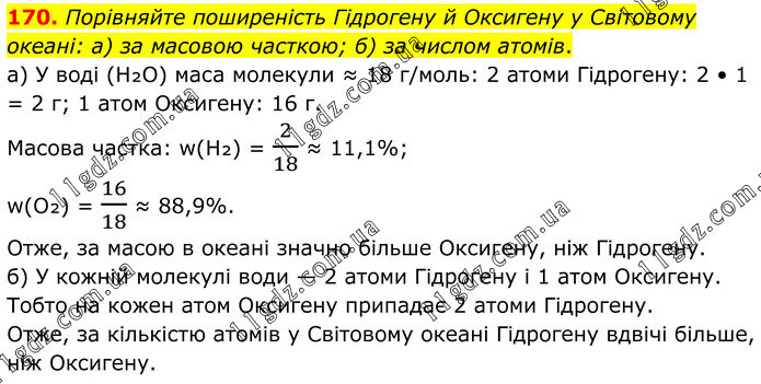 170. Порівняйте поширеність Гідрогену й Оксигену у Світовому океані: а) за масовою часткою; б) за числом атомів. а) У воді (H₂O) маса молекули ≈ 18 г/моль: 2 атоми Гідрогену: 2 • 1 = 2 г; 1 атом Оксигену: 16 г. Масова частка: w(H₂) = 2/18 ≈ 11,1%; w(O₂) = 16/18 ≈ 88,9%. Отже, за масою в океані значно більше Оксигену, ніж Гідрогену. б) У кожній молекулі води — 2 атоми Гідрогену і 1 атом Оксигену. Тобто на кожен атом Оксигену припадає 2 атоми Гідрогену. Отже, за кількістю атомів у Світовому океані Гідрогену вдвічі більше, ніж Оксигену.