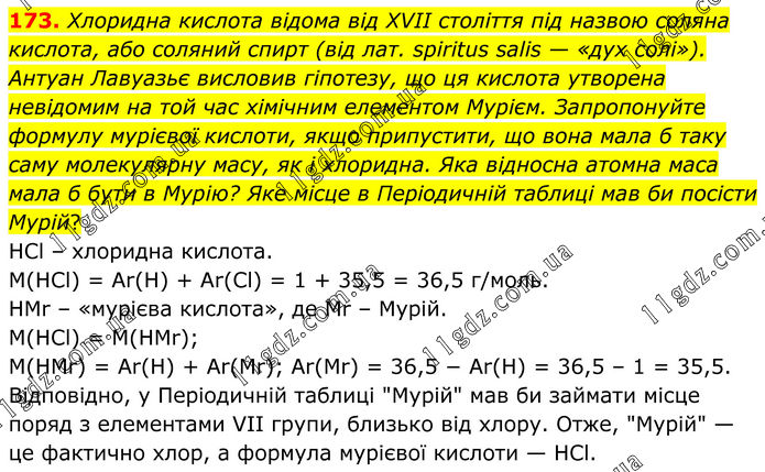 173. Хлоридна кислота відома від XVII століття під назвою соляна кислота, або соляний спирт (від лат. spiritus salis — «дух солі»). Антуан Лавуазьє висловив гіпотезу, що ця кислота утворена невідомим на той час хімічним елементом Мурієм. Запропонуйте формулу мурієвої кислоти, якщо припустити, що вона мала б таку саму молекулярну масу, як і хлоридна. Яка відносна атомна маса мала б бути в Мурію? Яке місце в Періодичній таблиці мав би посісти Мурій? HCl – хлоридна кислота. M(HCl) = Ar(H) + Ar(Cl) = 1 + 35,5 = 36,5 г/моль. HMr – «мурієва кислота», де Mr – Мурій. M(HCl) = M(HMr); M(HMr) = Ar(H) + Ar(Mr); Ar(Mr) = 36,5 − Ar(H) = 36,5 – 1 = 35,5. Відповідно, у Періодичній таблиці "Мурій" мав би займати місце поряд з елементами VII групи, близько від хлору. Отже, "Мурій" — це фактично хлор, а формула мурієвої кислоти — HCl.