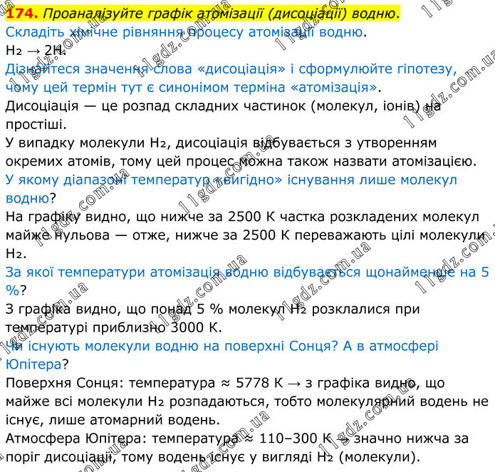 174. Проаналізуйте графік атомізації (дисоціації) водню. Складіть хімічне рівняння процесу атомізації водню. H₂ → 2H. Дізнайтеся значення слова «дисоціація» і сформулюйте гіпотезу, чому цей термін тут є синонімом терміна «атомізація». Дисоціація — це розпад складних частинок (молекул, іонів) на простіші. У випадку молекули H₂, дисоціація відбувається з утворенням окремих атомів, тому цей процес можна також назвати атомізацією. У якому діапазоні температур «вигідно» існування лише молекул водню? На графіку видно, що нижче за 2500 К частка розкладених молекул майже нульова — отже, нижче за 2500 К переважають цілі молекули H₂. За якої температури атомізація водню відбувається щонайменше на 5 %? З графіка видно, що понад 5 % молекул H₂ розклалися при температурі приблизно 3000 К. Чи існують молекули водню на поверхні Сонця? А в атмосфері Юпітера? Поверхня Сонця: температура ≈ 5778 К → з графіка видно, що майже всі молекули H₂ розпадаються, тобто молекулярний водень не існує, лише атомарний водень. Атмосфера Юпітера: температура ≈ 110–300 К → значно нижча за поріг дисоціації, тому водень існує у вигляді H₂ (молекули).