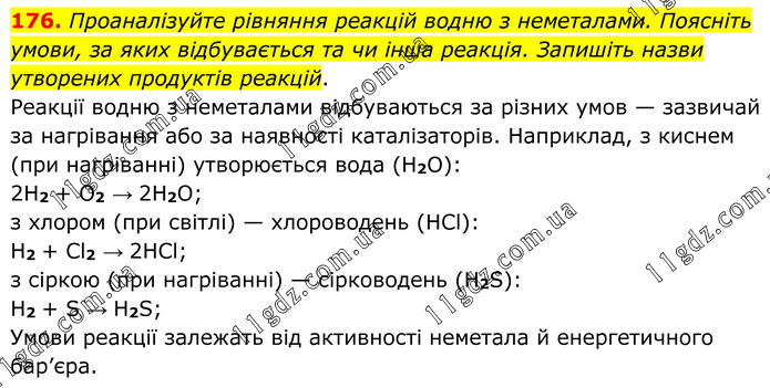 Проаналізуйте рівняння реакцій водню з неметалами. Поясніть умови, за яких відбувається та чи інша реакція. Запишіть назви утворених продуктів реакцій. Реакції водню з неметалами відбуваються за різних умов — зазвичай за нагрівання або за наявності каталізаторів. Наприклад, з киснем (при нагріванні) утворюється вода (H2O): 2H2 + O2 → 2H2O; з хлором (при світлі) — хлороводень (HCl): H2 + Cl2 → 2HCl; з сіркою (при нагріванні) — сірководень (H2S): H2 + S → H2S; Умови реакції залежать від активності неметала й енергетичного бар’єра.