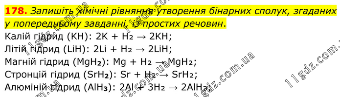 Запишіть хімічні рівняння утворення бінарних сполук, згаданих у попередньому завданні, із простих речовин. Калій гідрид (KH): 2K + H₂ → 2KH; Літій гідрид (LiH): 2Li + H₂ → 2LiH; Магній гідрид (MgH2): Mg + H₂ → MgH₂; Стронцій гідрид (SrH2): Sr + H₂ → SrH₂; Алюміній гідрид (AlH3): 2Al + 3H₂ → 2AlH₃;