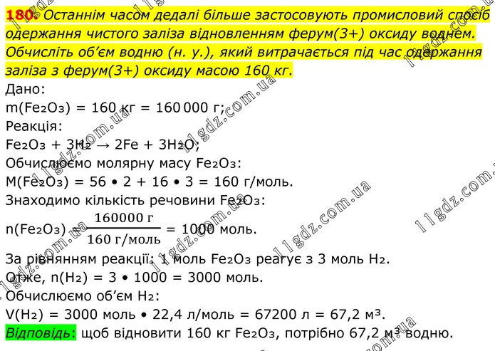 Останнім часом дедалі більше застосовують промисловий спосіб одержання чистого заліза відновленням ферум(3+) оксиду воднем. Обчисліть об’єм водню (н. у.), який витрачається під час одержання заліза з ферум(3+) оксиду масою 160 кг. Дано: m(Fe₂O₃) = 160 кг = 160 000 г; Реакція: Fe₂O₃ + 3H₂ → 2Fe + 3H₂O; Обчислюємо молярну масу Fe₂O₃: М(Fe₂O₃) = 56 • 2 + 16 • 3 = 160 г/моль. Знаходимо кількість речовини Fe₂O₃: n(Fe₂O₃) = (160000 г)/(160 г/моль) = 1000 моль. За рівнянням реакції: 1 моль Fe₂O₃ реагує з 3 моль H₂. Отже, n(H₂) = 3 • 1000 = 3000 моль. Обчислюємо об’єм H₂: V(H₂) = 3000 моль • 22,4 л/моль = 67200 л = 67,2 м³. Відповідь: щоб відновити 160 кг Fe₂O₃, потрібно 67,2 м³ водню.