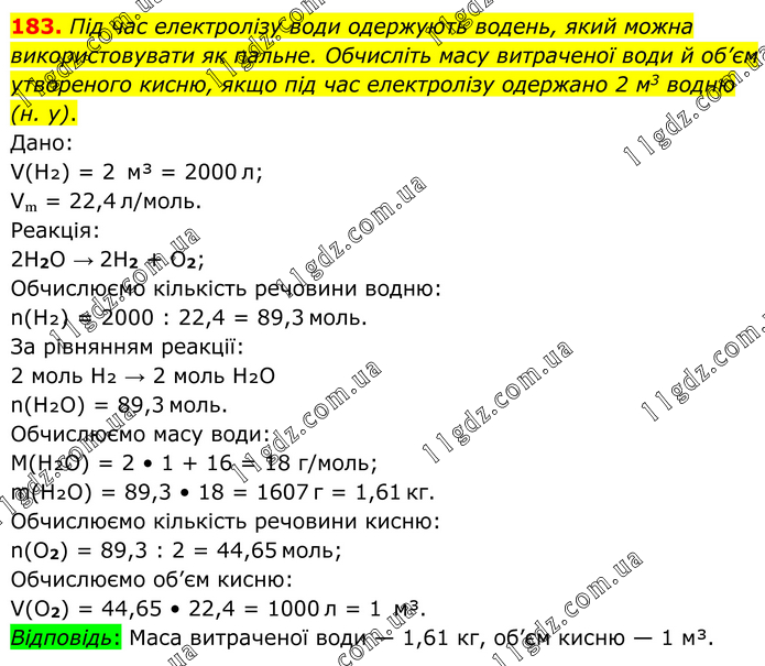 Під час електролізу води одержують водень, який можна використовувати як пальне. Обчисліть масу витраченої води й об’єм утвореного кисню, якщо під час електролізу одержано 2 м3 водню (н. у). Дано: V(H₂) = 2 м³ = 2000 л; Vₘ = 22,4 л/моль. Реакція: 2H2O → 2H2 + O2; Обчислюємо кількість речовини водню: n(H₂) = 2000 : 22,4 = 89,3 моль. За рівнянням реакції: 2 моль H₂ → 2 моль H₂O n(H₂O) = 89,3 моль. Обчислюємо масу води: М(H₂O) = 2 • 1 + 16 = 18 г/моль; m(H₂O) = 89,3 • 18 = 1607 г = 1,61 кг. Обчислюємо кількість речовини кисню: n(O2) = 89,3 : 2 = 44,65 моль; Обчислюємо об’єм кисню: V(O2) = 44,65 • 22,4 = 1000 л = 1 м³. Відповідь: Маса витраченої води — 1,61 кг, об’єм кисню — 1 м³.