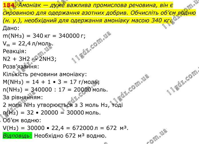 Амоніак — дуже важлива промислова речовина, він є сировиною для одержання азотних добрив. Обчисліть об’єм водню (н. у.), необхідний для одержання амоніаку масою 340 кг. Дано: m(NH₃) = 340 кг = 340000 г; Vₘ = 22,4 л/моль. Реакція: N2 + 3H2 → 2NH3; Розв’язання: Кількість речовини амоніаку: М(NH₃) = 14 + 1 • 3 = 17 г/моль; n(NH₃) = 340000 : 17 = 20000 моль. За рівнянням: 2 моль NH₃ утворюється з 3 моль H₂, тоді n(H₂) = 32 • 20000 = 30000 моль. Об’єм водню: V(H₂) = 30000 • 22,4 = 672000 л = 672 м³. Відповідь: Необхідно 672 м³ водню.