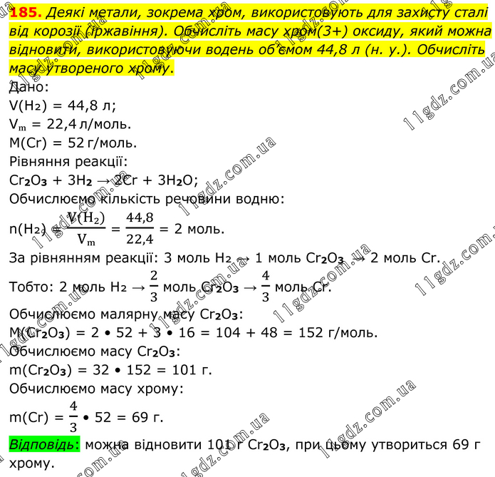 Деякі метали, зокрема хром, використовують для захисту сталі від корозії (іржавіння). Обчисліть масу хром(3+) оксиду, який можна відновити, використовуючи водень об’ємом 44,8 л (н. у.). Обчисліть масу утвореного хрому. Дано: V(H₂) = 44,8 л; Vₘ = 22,4 л/моль. М(Cr) = 52 г/моль. Рівняння реакції: Cr2O3 + 3H2 → 2Cr + 3H2O; Обчислюємо кількість речовини водню: n(H₂) = (V(H₂))/(Vₘ) = 44,8/22,4 = 2 моль. За рівнянням реакції: 3 моль H₂ → 1 моль Cr2O3 → 2 моль Cr. Тобто: 2 моль H₂ → 2/3 моль Cr2O3 → 4/3 моль Cr. Обчислюємо малярну масу Cr2O3: M(Cr2O3) = 2 • 52 + 3 • 16 = 104 + 48 = 152 г/моль. Обчислюємо масу Cr2O3: m(Cr2O3) = 32 • 152 = 101 г. Обчислюємо масу хрому: m(Cr) = 4/3 • 52 = 69 г. Відповідь: можна відновити 101 г Cr2O3, при цьому утвориться 69 г хрому.