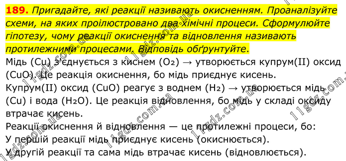 Пригадайте, які реакції називають окисненням. Проаналізуйте схеми, на яких проілюстровано два хімічні процеси. Сформулюйте гіпотезу, чому реакції окиснення та відновлення називають протилежними процесами. Відповідь обґрунтуйте. Мідь (Cu) з'єднується з киснем (O₂) → утворюється купрум(ІІ) оксид (CuO). Це реакція окиснення, бо мідь приєднує кисень. Купрум(ІІ) оксид (CuO) реагує з воднем (H₂) → утворюється мідь (Cu) і вода (H₂O). Це реакція відновлення, бо мідь у складі оксиду втрачає кисень. Реакції окиснення й відновлення — це протилежні процеси, бо: У першій реакції мідь приєднує кисень (окиснюється). У другій реакції та сама мідь втрачає кисень (відновлюється).