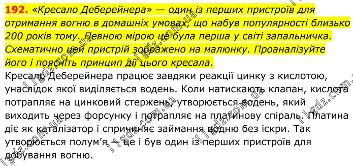 «Кресало Деберейнера» — один із перших пристроїв для отримання вогню в домашніх умовах, що набув популярності близько 200 років тому. Певною мірою це була перша у світі запальничка. Схематично цей пристрій зображено на малюнку. Проаналізуйте його і поясніть принцип дії цього кресала. Кресало Деберейнера працює завдяки реакції цинку з кислотою, унаслідок якої виділяється водень. Коли натискають клапан, кислота потрапляє на цинковий стержень, утворюється водень, який виходить через форсунку і потрапляє на платинову спіраль. Платина діє як каталізатор і спричиняє займання водню без іскри. Так утворюється полум’я — це і був один із перших пристроїв для добування вогню.