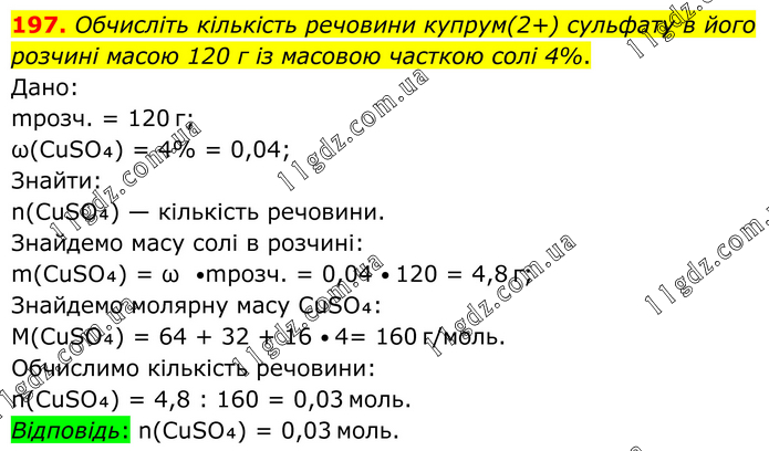 Обчисліть кількість речовини купрум(2+) сульфату в його розчині масою 120 г із масовою часткою солі 4%. Дано: mрозч. = 120 г; ω(CuSO₄) = 4% = 0,04; Знайти: n(CuSO₄) — кількість речовини. Знайдемо масу солі в розчині: m(CuSO₄) = ω •mрозч. = 0,04 • 120 = 4,8 г; Знайдемо молярну масу CuSO₄: M(CuSO₄) = 64 + 32 + 16 • 4= 160 г/моль. Обчислимо кількість речовини: n(CuSO₄) = 4,8 : 160 = 0,03 моль. Відповідь: n(CuSO₄) = 0,03 моль.