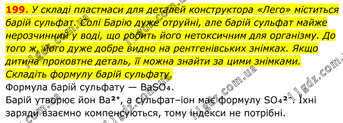 У складі пластмаси для деталей конструктора «Лего» міститься барій сульфат. Солі Барію дуже отруйні, але барій сульфат майже нерозчинний у воді, що робить його нетоксичним для організму. До того ж, його дуже добре видно на рентгенівських знімках. Якщо дитина проковтне деталь, її можна знайти за цими знімками. Складіть формулу барій сульфату. Формула барій сульфату — BaSO₄. Барій утворює йон Ba²⁺, а сульфат–іон має формулу SO₄²⁻. Їхні заряди взаємно компенсуються, тому індекси не потрібні.