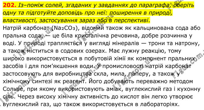Із–поміж солей, згаданих у завданнях до параграфа, оберіть одну та підготуйте доповідь про неї: поширення в природі, властивості, застосування зараз або в перспективі. Натрій карбонат (Na₂CO₃), відомий також як кальцинована сода або пральна сода, — це біла кристалічна речовина, добре розчинна у воді. У природі трапляється у вигляді мінералів — трони та натрону, а також міститься в содових озерах. Має лужну реакцію, тому широко використовується в побутовій хімії як компонент пральних засобів і для пом’якшення води. У промисловості натрій карбонат застосовують для виробництва скла, мила, паперу, а також у хімічному синтезі як реагент. Його добувають переважно методом Сольве, при якому використовують аміак, вуглекислий газ і кухонну сіль. Через високу хімічну активність до кислот він легко утворює вуглекислий газ, що також використовується в лабораторіях.