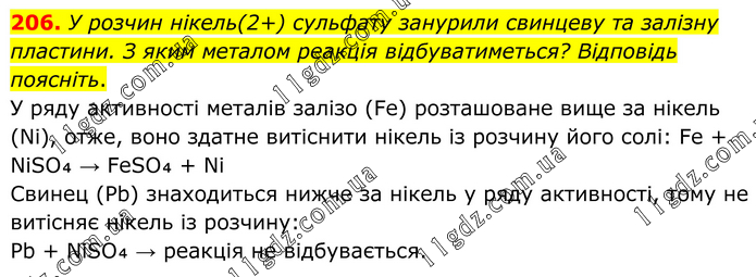 У розчин нікель(2+) сульфату занурили свинцеву та залізну пластини. З яким металом реакція відбуватиметься? Відповідь поясніть. У ряду активності металів залізо (Fe) розташоване вище за нікель (Ni), отже, воно здатне витіснити нікель із розчину його солі: Fe + NiSO₄ → FeSO₄ + Ni Свинец (Pb) знаходиться нижче за нікель у ряду активності, тому не витісняє нікель із розчину: Pb + NiSO₄ → реакція не відбувається.