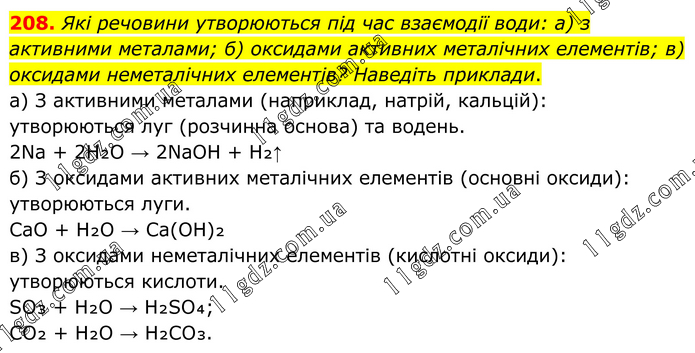 Які речовини утворюються під час взаємодії води: а) з активними металами; б) оксидами активних металічних елементів; в) оксидами неметалічних елементів? Наведіть приклади. а) З активними металами (наприклад, натрій, кальцій): утворюються луг (розчинна основа) та водень. 2Na + 2H₂O → 2NaOH + H₂↑ б) З оксидами активних металічних елементів (основні оксиди): утворюються луги. CaO + H₂O → Ca(OH)₂ в) З оксидами неметалічних елементів (кислотні оксиди): утворюються кислоти. SO₃ + H₂O → H₂SO₄; CO₂ + H₂O → H₂CO₃.