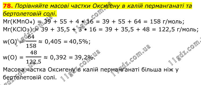78. Порівняйте масові частки Оксигену в калій перманганаті та бертолетовій солі. Mr(KMnO₄) = 39 + 55 + 4 • 16 = 39 + 55 + 64 = 158 г/моль; Mr(KClO₃) = 39 + 35,5 + 3 • 16 = 39 + 35,5 + 48 = 122,5 г/моль; w(O) = 64/158 ≈ 0,405 = 40,5%; w(O) = 48/122,5 ≈ 0,392 = 39,2%. Масова частка Оксигену в калій перманганаті більша ніж у бертолетовій солі.
