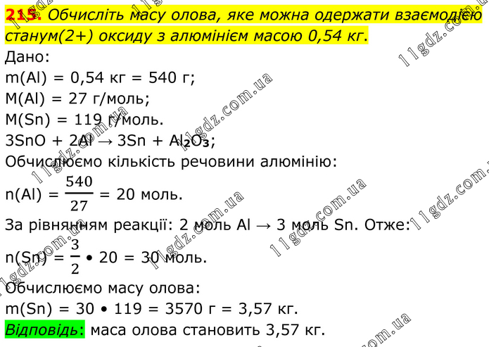 Обчисліть масу олова, яке можна одержати взаємодією станум(2+) оксиду з алюмінієм масою 0,54 кг. Дано: m(Al) = 0,54 кг = 540 г; M(Al) = 27 г/моль; M(Sn) = 119 г/моль. 3SnO + 2Al → 3Sn + Al2O3; Обчислюємо кількість речовини алюмінію: n(Al) = 540/27 = 20 моль. За рівнянням реакції: 2 моль Al → 3 моль Sn. Отже: n(Sn) = 3/2 • 20 = 30 моль. Обчислюємо масу олова: m(Sn) = 30 • 119 = 3570 г = 3,57 кг. Відповідь: маса олова становить 3,57 кг.