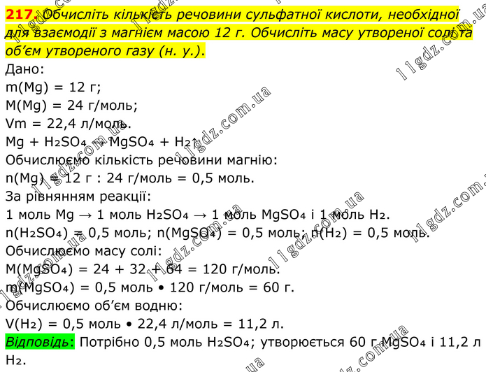 Обчисліть кількість речовини сульфатної кислоти, необхідної для взаємодії з магнієм масою 12 г. Обчисліть масу утвореної солі та об’єм утвореного газу (н. у.). Дано: m(Mg) = 12 г; M(Mg) = 24 г/моль; Vm = 22,4 л/моль. Mg + H₂SO₄ → MgSO₄ + H₂↑ Обчислюємо кількість речовини магнію: n(Mg) = 12 г : 24 г/моль = 0,5 моль. За рівнянням реакції: 1 моль Mg → 1 моль H₂SO₄ → 1 моль MgSO₄ і 1 моль H₂. n(H₂SO₄) = 0,5 моль; n(MgSO₄) = 0,5 моль; n(H₂) = 0,5 моль. Обчислюємо масу солі: M(MgSO₄) = 24 + 32 + 64 = 120 г/моль. m(MgSO₄) = 0,5 моль • 120 г/моль = 60 г. Обчислюємо об’єм водню: V(H₂) = 0,5 моль • 22,4 л/моль = 11,2 л. Відповідь: Потрібно 0,5 моль H₂SO₄; утворюється 60 г MgSO₄ і 11,2 л H₂.