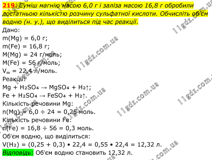 Суміш магнію масою 6,0 г і заліза масою 16,8 г обробили достатньою кількістю розчину сульфатної кислоти. Обчисліть об’єм водню (н. у.), що виділиться під час реакції. Дано: m(Mg) = 6,0 г; m(Fe) = 16,8 г; M(Mg) = 24 г/моль; M(Fe) = 56 г/моль; Vₘ = 22,4 л/моль. Реакції: Mg + H₂SO₄ → MgSO₄ + H₂↑; Fe + H₂SO₄ → FeSO₄ + H₂↑. Кількість речовини Mg: n(Mg) = 6,0 ÷ 24 = 0,25 моль. Кількість речовини Fe: n(Fe) = 16,8 ÷ 56 = 0,3 моль. Обʼєм водню, що виділиться: V(H₂) = (0,25 + 0,3) • 22,4 = 0,55 • 22,4 = 12,32 л. Відповідь: Обʼєм водню становить 12,32 л.