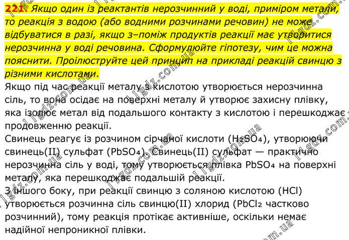 Якщо один із реактантів нерозчинний у воді, приміром метали, то реакція з водою (або водними розчинами речовин) не може відбуватися в разі, якщо з–поміж продуктів реакції має утворитися нерозчинна у воді речовина. Сформулюйте гіпотезу, чим це можна пояснити. Проілюструйте цей принцип на прикладі реакцій свинцю з різними кислотами. Якщо під час реакції металу з кислотою утворюється нерозчинна сіль, то вона осідає на поверхні металу й утворює захисну плівку, яка ізолює метал від подальшого контакту з кислотою і перешкоджає продовженню реакції. Свинець реагує із розчином сірчаної кислоти (H₂SO₄), утворюючи свинець(II) сульфат (PbSO₄). Свинець(II) сульфат — практично нерозчинна сіль у воді, тому утворюється плівка PbSO₄ на поверхні металу, яка перешкоджає подальшій реакції. З іншого боку, при реакції свинцю з соляною кислотою (HCl) утворюється розчинна сіль свинцю(II) хлорид (PbCl₂ частково розчинний), тому реакція протікає активніше, оскільки немає надійної непроникної плівки.
