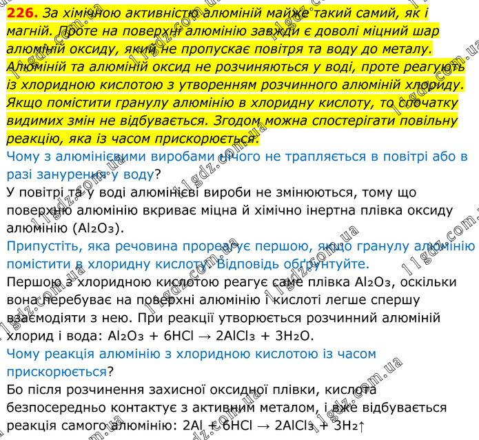 За хімічною активністю алюміній майже такий самий, як і магній. Проте на поверхні алюмінію завжди є доволі міцний шар алюміній оксиду, який не пропускає повітря та воду до металу. Алюміній та алюміній оксид не розчиняються у воді, проте реагують із хлоридною кислотою з утворенням розчинного алюміній хлориду. Якщо помістити гранулу алюмінію в хлоридну кислоту, то спочатку видимих змін не відбувається. Згодом можна спостерігати повільну реакцію, яка із часом прискорюється. Чому з алюмінієвими виробами нічого не трапляється в повітрі або в разі занурення у воду? У повітрі та у воді алюмінієві вироби не змінюються, тому що поверхню алюмінію вкриває міцна й хімічно інертна плівка оксиду алюмінію (Al₂O₃). Припустіть, яка речовина прореагує першою, якщо гранулу алюмінію помістити в хлоридну кислоту. Відповідь обґрунтуйте. Першою з хлоридною кислотою реагує саме плівка Al₂O₃, оскільки вона перебуває на поверхні алюмінію і кислоті легше спершу взаємодіяти з нею. При реакції утворюється розчинний алюміній хлорид і вода: Al₂O₃ + 6HCl → 2AlCl₃ + 3H₂O. Чому реакція алюмінію з хлоридною кислотою із часом прискорюється? Бо після розчинення захисної оксидної плівки, кислота безпосередньо контактує з активним металом, і вже відбувається реакція самого алюмінію: 2Al + 6HCl → 2AlCl₃ + 3H₂↑