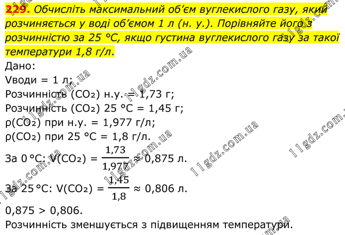 Обчисліть максимальний об’єм вуглекислого газу, який розчиняється у воді об’ємом 1 л (н. у.). Порівняйте його з розчинністю за 25 °С, якщо густина вуглекислого газу за такої температури 1,8 г/л. Дано: Vводи = 1 л; Розчинність (CO₂) н.у. = 1,73 г; Розчинність (CO₂) 25 °С = 1,45 г; ρ(CO₂) при н.у. = 1,977 г/л; ρ(CO₂) при 25 °С = 1,8 г/л. За 0 °C: V(CO₂) = 1,73/1,977 ≈ 0,875 л. За 25 °C: V(CO₂) = 1,45/1,8 ≈ 0,806 л. 0,875 > 0,806. Розчинність зменшується з підвищенням температури.