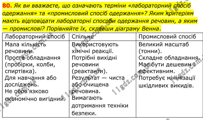 80. Як ви вважаєте, що означають терміни «лабораторний спосіб одержання» та «промисловий спосіб одержання»? Яким критеріям мають відповідати лабораторні способи одержання речовин, а яким — промислові? Порівняйте їх, склавши діаграму Венна. Лабораторний спосіб Спільне Промисловий спосіб Мала кількість речовини. Просте обладнання (пробірки, колби, спиртівка). Для навчання або досліджень. Не обов’язково економічно вигідний. Використовують хімічні реакції. Потрібні вихідні речовини (реактанти). Результат — чиста або очищена речовина. Вимагають дотримання техніки безпеки. Великий масштаб (тонни). Складне обладнання. Має бути дешевим і ефективним. Потребує мінімізації шкідливих викидів.