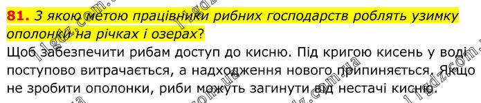 81. 3 якою метою працівники рибних господарств роблять узимку ополонки на річках і озерах? Щоб забезпечити рибам доступ до кисню. Під кригою кисень у воді поступово витрачається, а надходження нового припиняється. Якщо не зробити ополонки, риби можуть загинути від нестачі кисню.