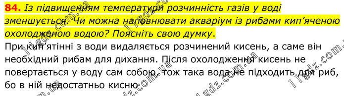 84. Із підвищенням температури розчинність газів у воді зменшується. Чи можна наповнювати акваріум із рибами кип’яченою охолодженою водою? Поясніть свою думку. При кип’ятінні з води видаляється розчинений кисень, а саме він необхідний рибам для дихання. Після охолодження кисень не повертається у воду сам собою, тож така вода не підходить для риб, бо в ній недостатньо кисню.