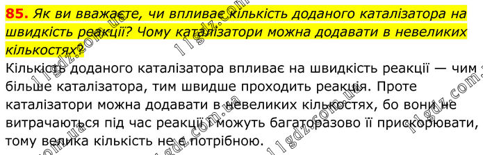 85. Як ви вважаєте, чи впливає кількість доданого каталізатора на швидкість реакції? Чому каталізатори можна додавати в невеликих кількостях? Кількість доданого каталізатора впливає на швидкість реакції — чим більше каталізатора, тим швидше проходить реакція. Проте каталізатори можна додавати в невеликих кількостях, бо вони не витрачаються під час реакції і можуть багаторазово її прискорювати, тому велика кількість не є потрібною.