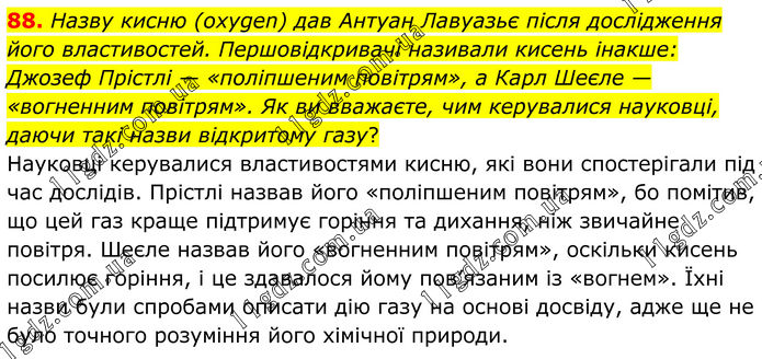 88. Назву кисню (oxygen) дав Антуан Лавуазьє після дослідження його властивостей. Першовідкривачі називали кисень інакше: Джозеф Прістлі — «поліпшеним повітрям», а Карл Шеєле — «вогненним повітрям». Як ви вважаєте, чим керувалися науковці, даючи такі назви відкритому газу? Науковці керувалися властивостями кисню, які вони спостерігали під час дослідів. Прістлі назвав його «поліпшеним повітрям», бо помітив, що цей газ краще підтримує горіння та дихання, ніж звичайне повітря. Шеєле назвав його «вогненним повітрям», оскільки кисень посилює горіння, і це здавалося йому пов’язаним із «вогнем». Їхні назви були спробами описати дію газу на основі досвіду, адже ще не було точного розуміння його хімічної природи.
