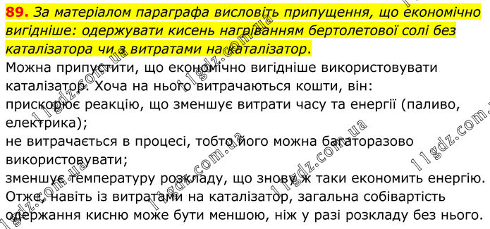 89. За матеріалом параграфа висловіть припущення, що економічно вигідніше: одержувати кисень нагріванням бертолетової солі без каталізатора чи з витратами на каталізатор. Можна припустити, що економічно вигідніше використовувати каталізатор. Хоча на нього витрачаються кошти, він: прискорює реакцію, що зменшує витрати часу та енергії (паливо, електрика); не витрачається в процесі, тобто його можна багаторазово використовувати; зменшує температуру розкладу, що знову ж таки економить енергію. Отже, навіть із витратами на каталізатор, загальна собівартість одержання кисню може бути меншою, ніж у разі розкладу без нього.