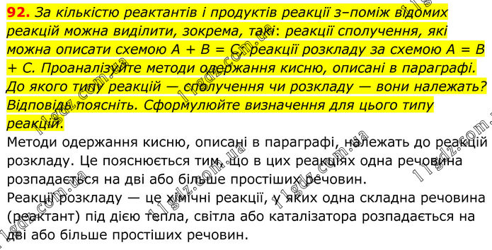 92. За кількістю реактантів і продуктів реакції з–поміж відомих реакцій можна виділити, зокрема, такі: реакції сполучення, які можна описати схемою А + B = C; реакції розкладу за схемою A = B + С. Проаналізуйте методи одержання кисню, описані в параграфі. До якого типу реакцій — сполучення чи розкладу — вони належать? Відповідь поясніть. Сформулюйте визначення для цього типу реакцій. Методи одержання кисню, описані в параграфі, належать до реакцій розкладу. Це пояснюється тим, що в цих реакціях одна речовина розпадається на дві або більше простіших речовин. Реакції розкладу — це хімічні реакції, у яких одна складна речовина (реактант) під дією тепла, світла або каталізатора розпадається на дві або більше простіших речовин.