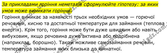 За прикладами горіння неметалів сформулюйте гіпотезу: за яких умов може виникати горіння. Горіння виникає за наявності трьох необхідних умов — горючої речовини, кисню та достатньої температури для займання (теплова енергія). Крім того, горіння може бути дуже швидким або навіть вибуховим, якщо речовина дуже активна або подрібнена (наприклад, борошно). Також можливе самозаймання речовин, температура займання яких близька до кімнатної.