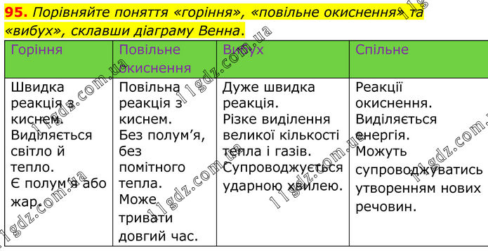 95. Порівняйте поняття «горіння», «повільне окиснення» та «вибух», склавши діаграму Венна. Горіння Повільне окиснення Вибух Спільне Швидка реакція з киснем. Виділяється світло й тепло. Є полум’я або жар. Повільна реакція з киснем. Без полум’я, без помітного тепла. Може тривати довгий час. Дуже швидка реакція. Різке виділення великої кількості тепла і газів. Супроводжується ударною хвилею. Реакції окиснення. Виділяється енергія. Можуть супроводжуватись утворенням нових речовин.