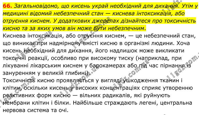 66. Загальновідомо, що кисень украй необхідний для дихання. Утім у медицині відомий небезпечний стан — киснева інтоксикація, або отруєння киснем. У додаткових джерелах дізнайтеся про токсичність кисню та за яких умов він може бути небезпечним. Киснева інтоксикація, або отруєння киснем, — це небезпечний стан, що виникає при надмірному вмісті кисню в організмі людини. Хоча кисень необхідний для дихання, його надлишок може викликати токсичні реакції, особливо при високому тиску (наприклад, при лікуванні лікарським киснем у барокамерах або під час пірнання із зануренням у великій глибині). Токсичність кисню проявляється у вигляді ушкодження тканин і клітин, оскільки кисень у високих концентраціях сприяє утворенню реактивних форм кисню — вільних радикалів, які руйнують мембрани клітин і білки. Найбільше страждають легені, центральна нервова система та очі.