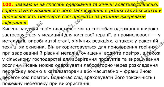 100. Зважаючи на способи одержання та хімічні властивості кисню, спрогнозуйте можливості його застосування в різних галузях життя й промисловості. Перевірте свої прогнози за різними джерелами інформації. Кисень завдяки своїм властивостям та способам одержання широко застосовується у медицині для кисневої терапії, в промисловості — у металургії, виробництві сталі, хімічних реакціях, а також у ракетній техніці як окисник. Він використовується для прискорення горіння при зварюванні й різанні металів, очищенні води та повітря, а також у сільському господарстві для зберігання продуктів та вирощування рослин. Кисень можна одержувати лабораторно через розкладання пероксиду водню з каталізаторами або масштабно – фракційною перегонкою повітря. Водночас слід враховувати його токсичність і пожежну небезпеку при використанні.