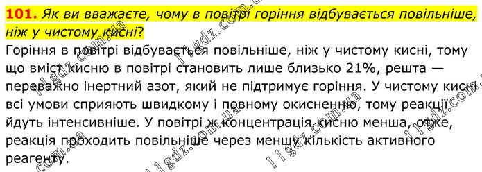 101. Як ви вважаєте, чому в повітрі горіння відбувається повільніше, ніж у чистому кисні? Горіння в повітрі відбувається повільніше, ніж у чистому кисні, тому що вміст кисню в повітрі становить лише близько 21%, решта — переважно інертний азот, який не підтримує горіння. У чистому кисні всі умови сприяють швидкому і повному окисненню, тому реакції йдуть інтенсивніше. У повітрі ж концентрація кисню менша, отже, реакція проходить повільніше через меншу кількість активного реагенту.