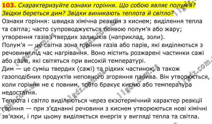 103. Схарактеризуйте ознаки горіння. Що собою являє полум’я? Звідки береться дим? Звідки виникають теплота й світло? Ознаки горіння: швидка хімічна реакція з киснем; виділення тепла та світла; часто супроводжується появою полум’я або жару; утворення газів і твердих залишків (наприклад, золи). Полум’я — це світна зона горіння газів або парів, які виділяються з речовини під час нагрівання. Воно містить розжарені частинки сажі або газів, які світяться при високій температурі. Дим — це суміш твердих (сажі) та рідких частинок, а також газоподібних продуктів неповного згоряння палива. Він утворюється, коли горіння не є повним, тобто бракує кисню або температура недостатня. Теплота і світло виділяються через екзотермічний характер реакції горіння — при з’єднанні речовини з киснем утворюються нові хімічні зв’язки, і при цьому виділяється енергія у вигляді тепла та світла.