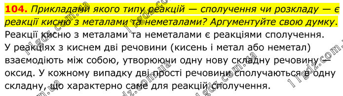 104. Прикладами якого типу реакцій — сполучення чи розкладу — є реакції кисню з металами та неметалами? Аргументуйте свою думку. Реакції кисню з металами та неметалами є реакціями сполучення. У реакціях з киснем дві речовини (кисень і метал або неметал) взаємодіють між собою, утворюючи одну нову складну речовину — оксид. У кожному випадку дві прості речовини сполучаються в одну складну, що характерно саме для реакцій сполучення.