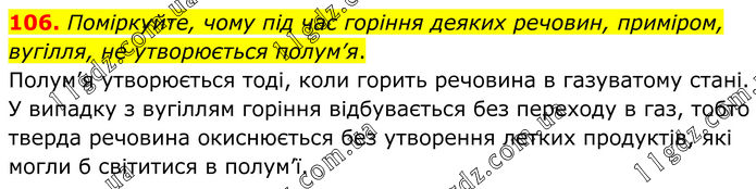 106. Поміркуйте, чому під час горіння деяких речовин, приміром, вугілля, не утворюється полум’я. Полум’я утворюється тоді, коли горить речовина в газуватому стані. У випадку з вугіллям горіння відбувається без переходу в газ, тобто тверда речовина окиснюється без утворення летких продуктів, які могли б світитися в полум’ї.