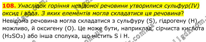 108. Унаслідок горіння невідомої речовини утворилися сульфур(ІV) оксид і вода. З яких елементів могла складатися ця речовина? Невідома речовина могла складатися з сульфуру (S), гідрогену (H), можливо, й оксигену (O). Це може бути, наприклад, сірчиста кислота (H₂SO₃) або інша сполука, що містить S і H.