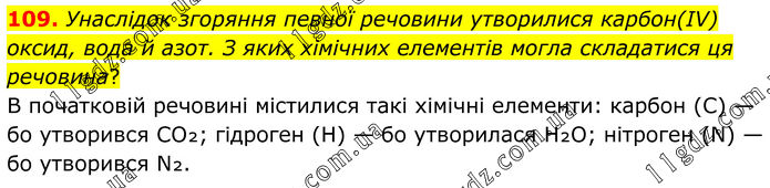 109. Унаслідок згоряння певної речовини утворилися карбон(ІV) оксид, вода й азот. З яких хімічних елементів могла складатися ця речовина? В початковій речовині містилися такі хімічні елементи: карбон (C) — бо утворився CO₂; гідроген (H) — бо утворилася H₂O; нітроген (N) — бо утворився N₂.