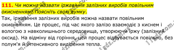 111. Чи можна назвати іржавіння залізних виробів повільним окисненням? Поясніть свою думку. Так, іржавіння залізних виробів можна назвати повільним окисненням. Це процес, під час якого залізо взаємодіє з киснем і вологою з навколишнього середовища, утворюючи іржу (залізний оксид). На відміну від горіння, цей процес відбувається повільно, без полум'я й інтенсивного виділення тепла.