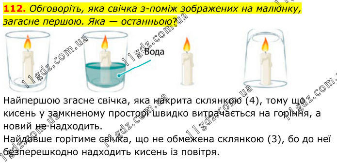 112. Обговоріть, яка свічка з-поміж зображених на малюнку, загасне першою. Яка — останньою? Найпершою згасне свічка, яка накрита склянкою (4), тому що кисень у замкненому просторі швидко витрачається на горіння, а новий не надходить. Найдовше горітиме свічка, що не обмежена склянкою (3), бо до неї безперешкодно надходить кисень із повітря.
