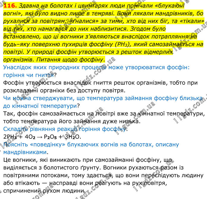 116. Здавна на болотах і цвинтарях люди помічали «блукаючі вогні», які було видно лише в темряві. Вони лякали мандрівників, бо рухалися за повітрям: «гналися» за тими, хто від них біг, та «тікали» від тих, хто намагався до них наблизитися. Згодом було встановлено, що ці вогники з’являються внаслідок потрапляння на будь–яку поверхню пухирців фосфіну (PH3), який самозаймається на повітрі. У природі фосфін утворюється з решток відмерлих організмів. Питання щодо фосфіну. Унаслідок яких природних процесів може утворюватися фосфін: горіння чи гниття? Фосфін утворюється внаслідок гниття решток організмів, тобто при розкладанні органіки без доступу повітря. Чи можна стверджувати, що температура займання фосфіну близька до кімнатної температури? Так, фосфін самозаймається на повітрі вже за кімнатної температури, тобто температура його займання дуже низька. Складіть рівняння реакції горіння фосфіну. 2PH3 + 4O2 → P2O5 + 3H2O. Поясніть «поведінку» блукаючих вогнів на болотах, описану мандрівниками. Це вогники, які виникають при самозайманні фосфіну, що виділяється з болотистого ґрунту. Вогники рухаються разом із повітряними потоками, тому здається, що вони переслідують людину або втікають — насправді вони реагують на рух повітря, спричинений рухом людини.