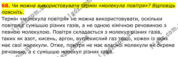 68. Чи можна використовувати термін «молекула повітря»? Відповідь поясніть. Термін «молекула повітря» не можна використовувати, оскільки повітря є сумішшю різних газів, а не одною хімічною речовиною з певною молекулою. Повітря складається з молекул різних газів, таких як азот, кисень, аргон, вуглекислий газ тощо, кожен із яких має свої молекули. Отже, повітря не має власної молекули як окрема речовина, а є сумішшю молекул різних газів.