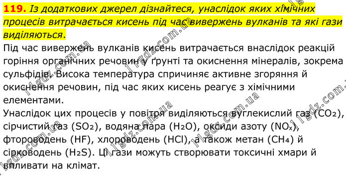 119. Із додаткових джерел дізнайтеся, унаслідок яких хімічних процесів витрачається кисень під час вивержень вулканів та які гази виділяються. Під час вивержень вулканів кисень витрачається внаслідок реакцій горіння органічних речовин у ґрунті та окиснення мінералів, зокрема сульфідів. Висока температура спричиняє активне згоряння й окиснення речовин, під час яких кисень реагує з хімічними елементами. Унаслідок цих процесів у повітря виділяються вуглекислий газ (CO₂), сірчистий газ (SO₂), водяна пара (H₂O), оксиди азоту (NOₓ), фтороводень (HF), хлороводень (HCl), а також метан (CH₄) й сірководень (H₂S). Ці гази можуть створювати токсичні хмари й впливати на клімат.