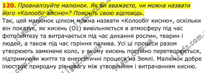 120. Проаналізуйте малюнок. Як ви вважаєте, чи можна назвати його «Колообіг кисню»? Поясніть свою відповідь. Так, цей малюнок цілком можна назвати «Колообіг кисню», оскільки він показує, як кисень (O₂) вивільняється в атмосферу під час фотосинтезу та витрачається під час дихання рослин, тварин і людей, а також під час горіння палива. Усі ці процеси разом утворюють замкнене коло, у якому кисень постійно перетворюється, підтримуючи життя та енергетичні процеси на Землі. Малюнок добре ілюструє природну рівновагу між утворенням і витрачанням кисню.