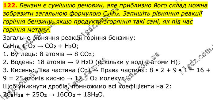 122. Бензин є сумішшю речовин, але приблизно його склад можна зобразити загальною формулою C8H18. Запишіть рівняння реакції горіння бензину, якщо продукти згоряння такі самі, як під час горіння метану. Загальне рівняння реакції горіння бензину: C8H18 + O2 → CO2 + H2O; 1. Вуглець: 8 атомів → 8 CO₂; 2. Водень: 18 атомів → 9 H₂O (оскільки у воді 2 атоми H); 3. Кисень: Ліва частина (O₂) → Права частина: 8 • 2 + 9 • 1 = 16 + 9 = 25 атомів кисню → 12,5 O₂ молекул. Щоб уникнути дробів, помножимо всі коефіцієнти на 2: 2C8H18 + 25O2 → 16CO2 + 18H2O.