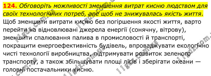 124. Обговоріть можливості зменшення витрат кисню людством для своїх технологічних потреб, але щоб не знижувалась якість життя. Щоб зменшити витрати кисню без погіршення якості життя, варто перейти на відновлювані джерела енергії (сонячну, вітрову), зменшити спалювання палива в промисловості й транспорті, покращити енергоефективність будівель, впроваджувати екологічно чисті технології виробництва, підтримувати розвиток зеленого транспорту, а також збільшувати площі лісів і зберігати океани — головні постачальники кисню.