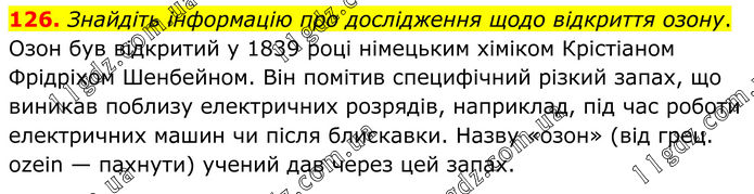 126. Знайдіть інформацію про дослідження щодо відкриття озону. Озон був відкритий у 1839 році німецьким хіміком Крістіаном Фрідріхом Шенбейном. Він помітив специфічний різкий запах, що виникав поблизу електричних розрядів, наприклад, під час роботи електричних машин чи після блискавки. Назву «озон» (від грец. ozein — пахнути) учений дав через цей запах.