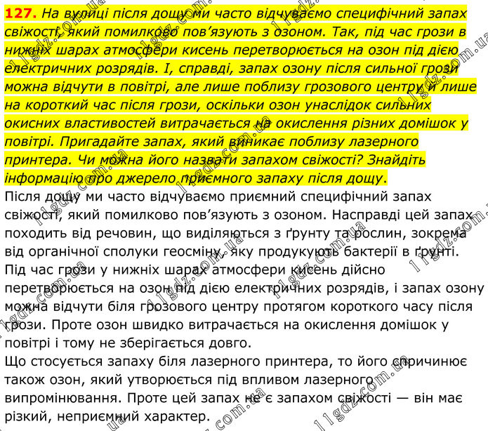 127. На вулиці після дощу ми часто відчуваємо специфічний запах свіжості, який помилково пов’язують з озоном. Так, під час грози в нижніх шарах атмосфери кисень перетворюється на озон під дією електричних розрядів. І, справді, запах озону після сильної грози можна відчути в повітрі, але лише поблизу грозового центру й лише на короткий час після грози, оскільки озон унаслідок сильних окисних властивостей витрачається на окислення різних домішок у повітрі. Пригадайте запах, який виникає поблизу лазерного принтера. Чи можна його назвати запахом свіжості? Знайдіть інформацію про джерело приємного запаху після дощу. Після дощу ми часто відчуваємо приємний специфічний запах свіжості, який помилково пов’язують з озоном. Насправді цей запах походить від речовин, що виділяються з ґрунту та рослин, зокрема від органічної сполуки геосміну, яку продукують бактерії в ґрунті. Під час грози у нижніх шарах атмосфери кисень дійсно перетворюється на озон під дією електричних розрядів, і запах озону можна відчути біля грозового центру протягом короткого часу після грози. Проте озон швидко витрачається на окислення домішок у повітрі і тому не зберігається довго. Що стосується запаху біля лазерного принтера, то його спричинює також озон, який утворюється під впливом лазерного випромінювання. Проте цей запах не є запахом свіжості — він має різкий, неприємний характер.